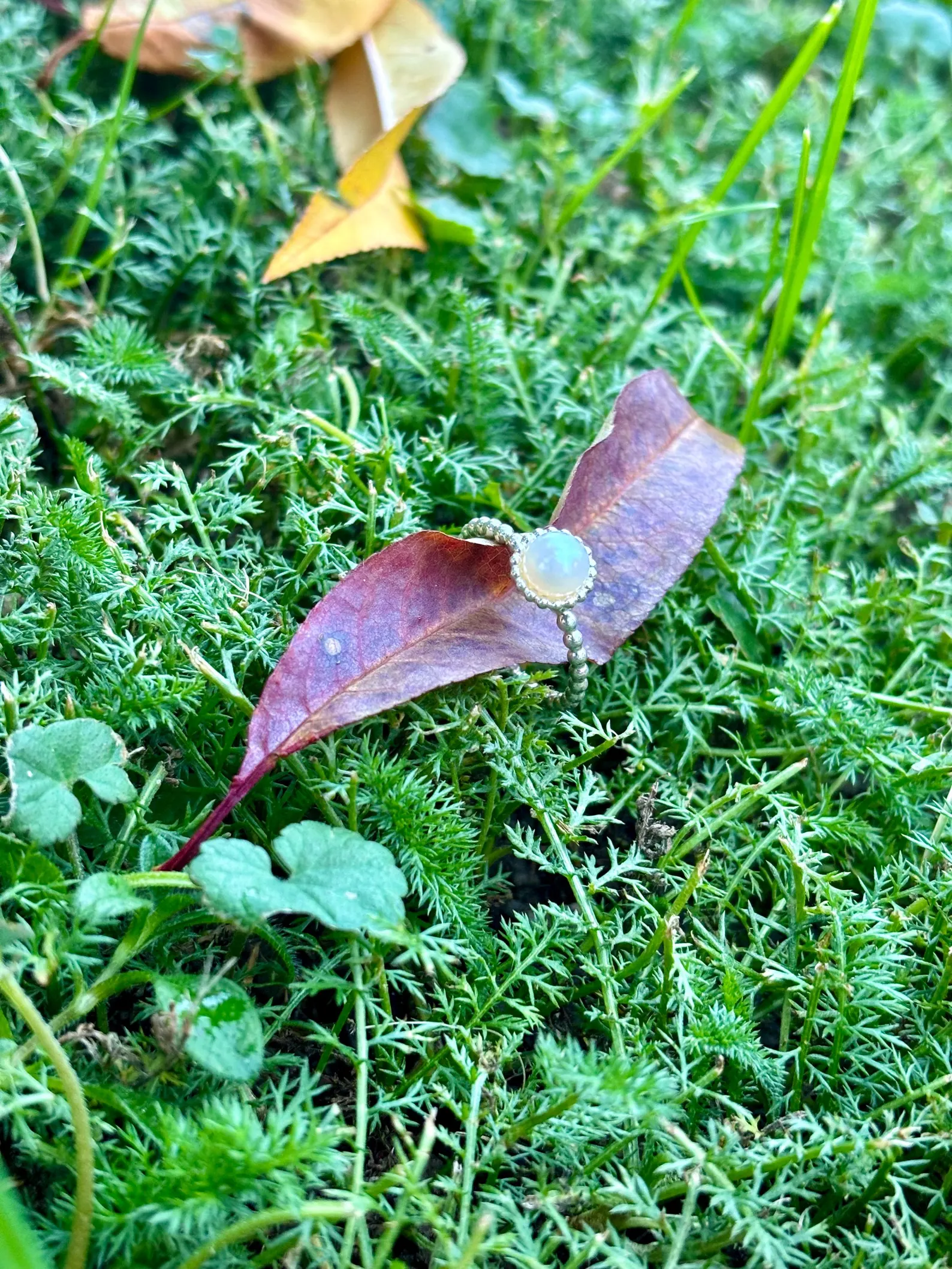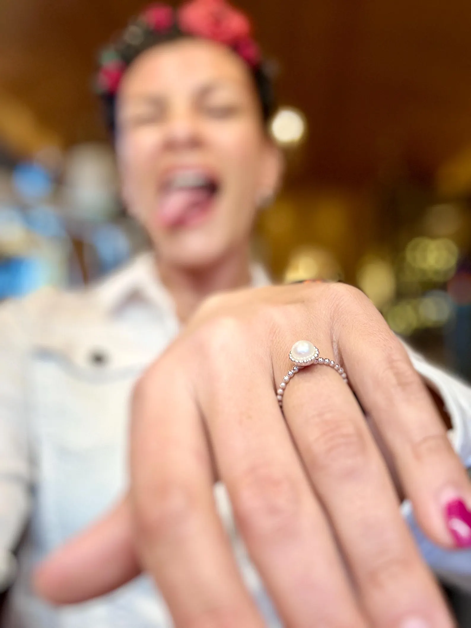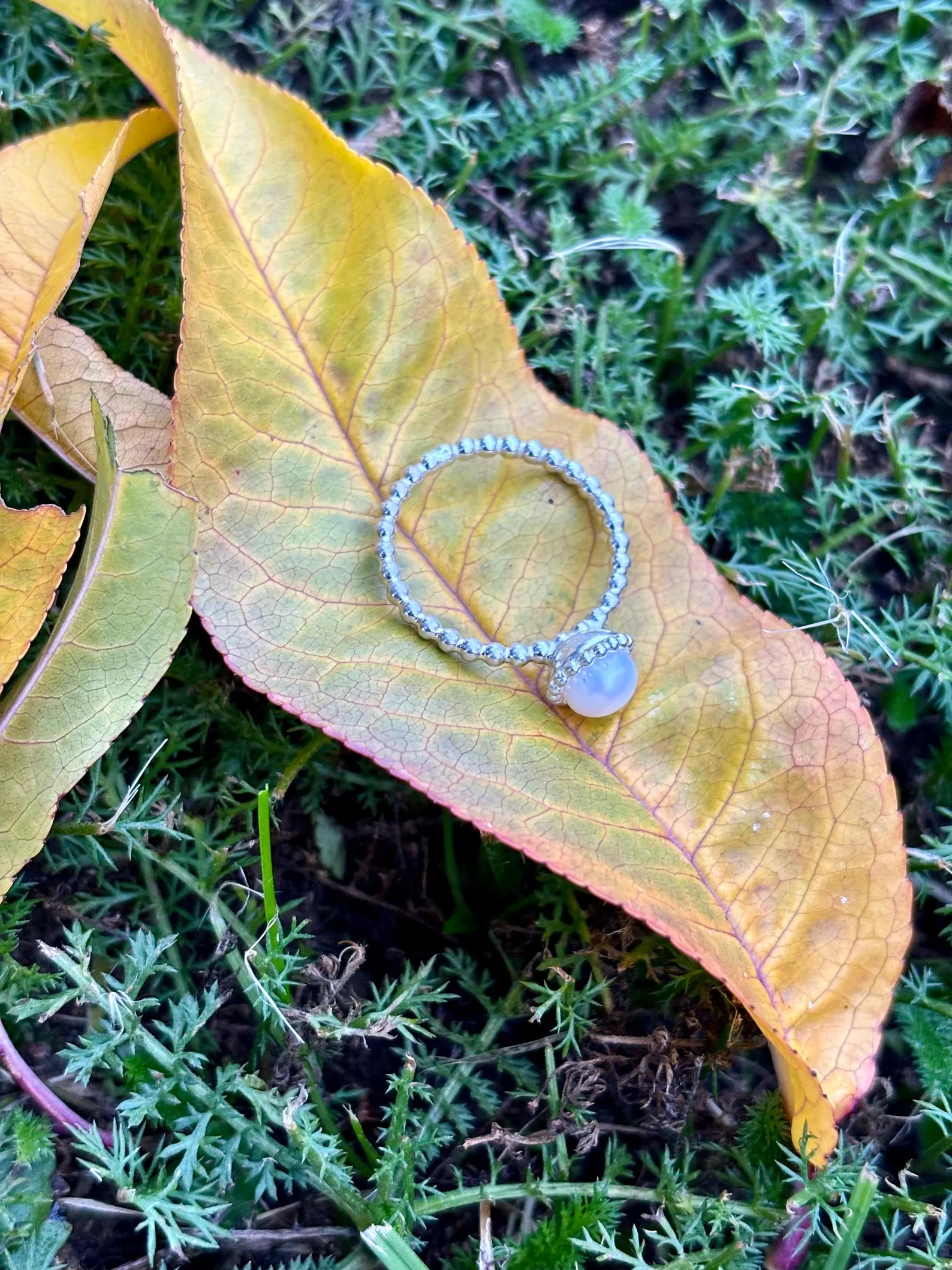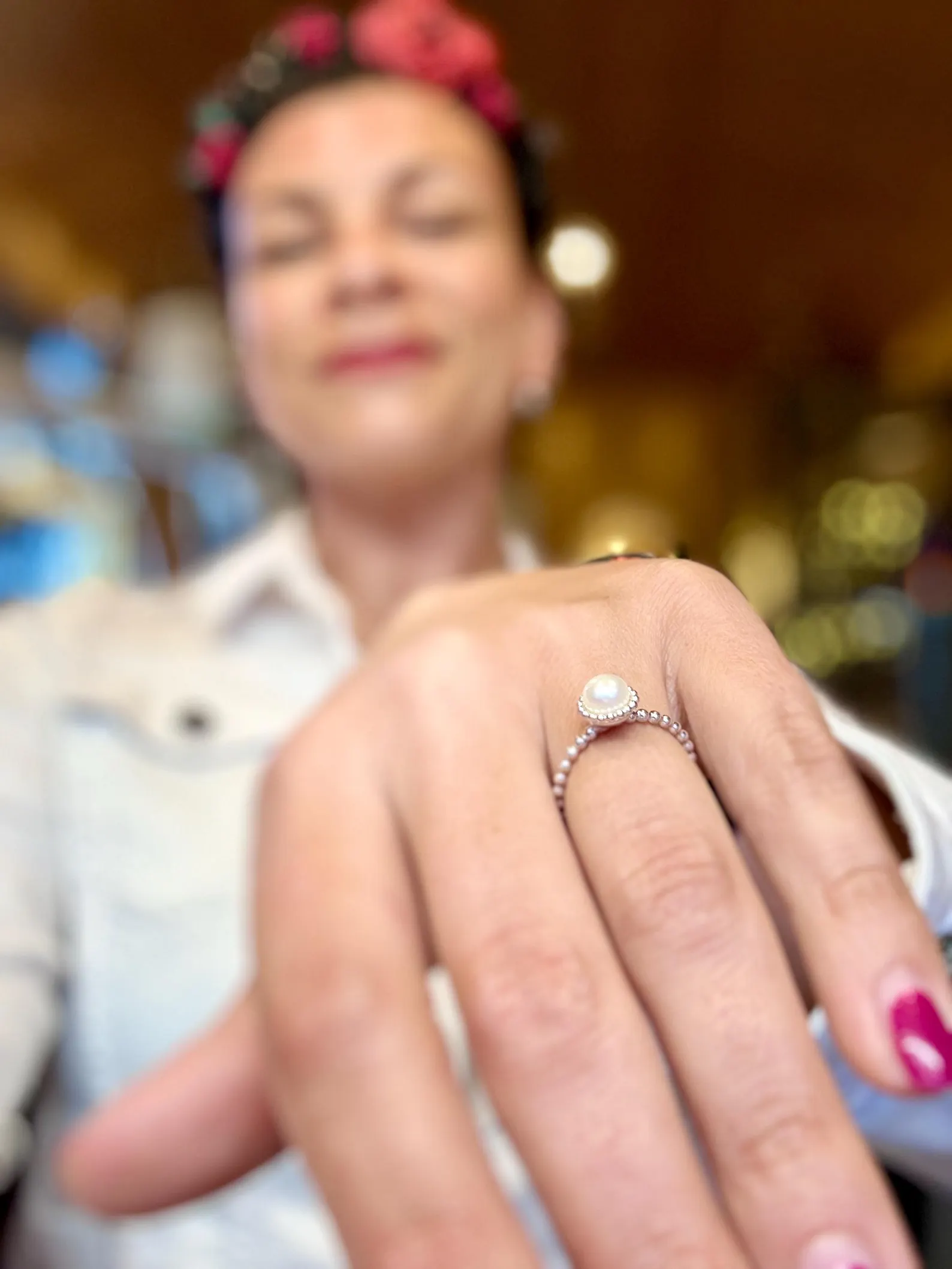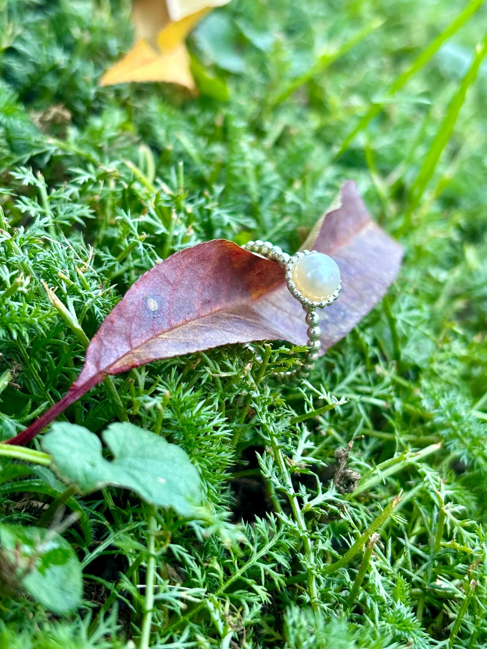 Ein schlichter Ring mit einer weißen Süßwasser-Zuchtperle, diese ist umringt von einen zarten Perldraht.